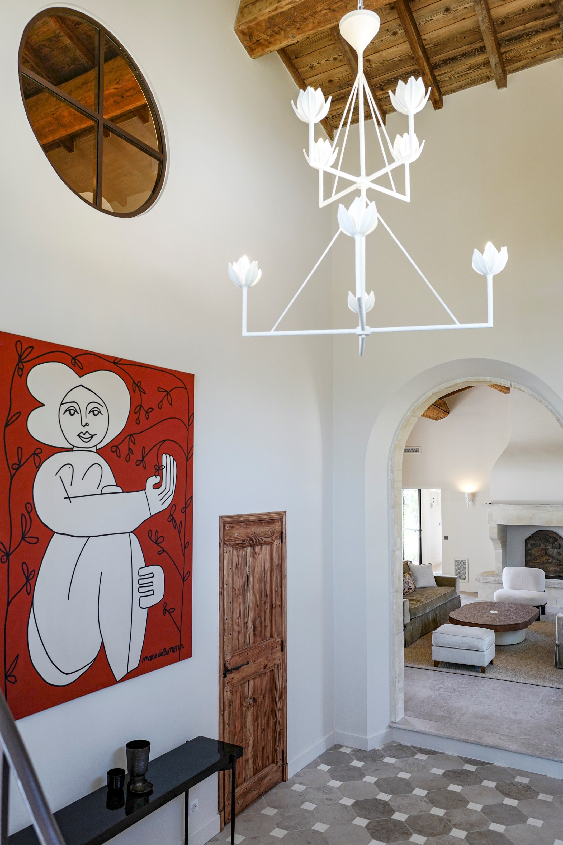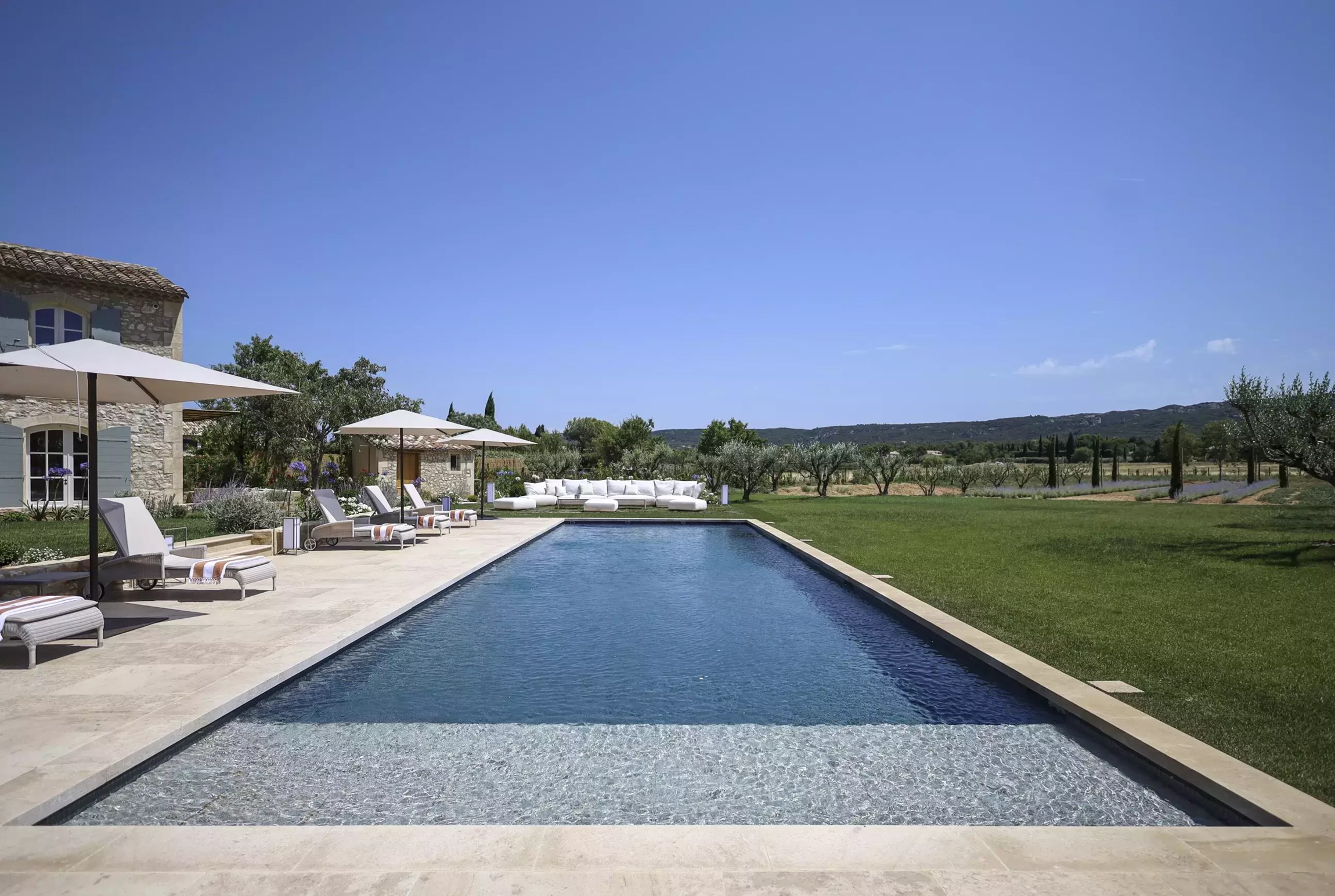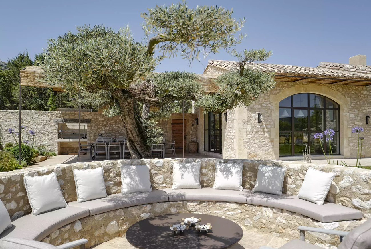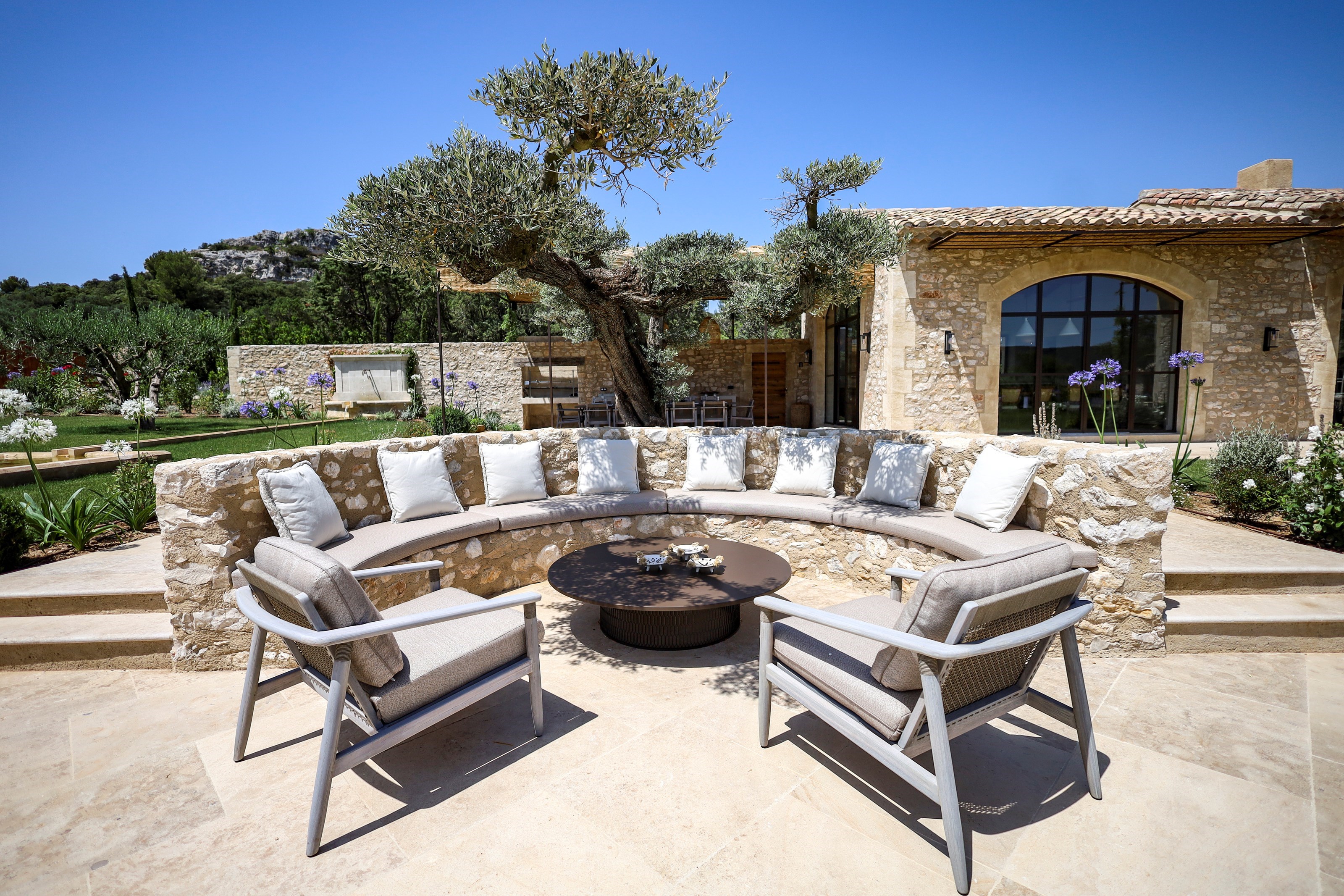 Ce mas provençal neuf séduit par son architecture élégante, mêlant luxe authentique et esprit contemporain. Construit avec des matériaux nobles issus du patrimoine local — pierre massive, bois et tuiles de terre cuite — il s’organise en deux ailes en L, l’une de plain-pied, l’autre sur deux niveaux. L’ensemble s’ouvre sur une vaste terrasse agrémentée d’un brasero et de banquettes maçonnées, offrant des vues remarquables sur les Alpilles.